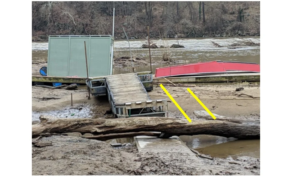 Shovel Team Arrival Time 9:00 AM on 1/26/19 Should the river level allow, your initial task is to dig out the aluminum walkway buried in sediment. The next task (depending on river level) will be to grade the sediment berm that will allow the repositioning of the floating walkway. The photograph below marks the area to grade.